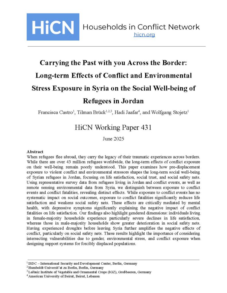 When refugees flee abroad, they carry the legacy of their traumatic experiences across borders. While there are over 43 million refugees worldwide, the long-term effects of conflict exposure on their well-being remain poorly understood. This paper examines how pre-displacement exposure to violent conflict and environmental stressors shapes the long-term social well-being of Syrian refugees in Jordan, focusing on life satisfaction, social trust, and social safety nets. Using representative survey data from refugees living in Jordan and conflict events, as well as remote sensing environmental data from Syria, we distinguish between exposure to conflict events and conflict fatalities, revealing distinct effects. While exposure to conflict events has no systematic impact on social outcomes, exposure to conflict fatalities significantly reduces life satisfaction and weakens social safety nets. These effects are critically mediated by mental health, with depressive symptoms significantly explaining the negative impact of conflict fatalities on life satisfaction. Our findings also highlight gendered dimensions: individuals living in female-majority households experience particularly severe declines in life satisfaction, whereas those in male-majority households show greater deterioration in social safety nets. Having experienced droughts before leaving Syria further amplifies the negative effects of conflict, particularly on social safety nets. These results highlight the importance of considering intersecting vulnerabilities due to gender, environmental stress, and conflict exposure when designing support systems for forcibly displaced populations.
